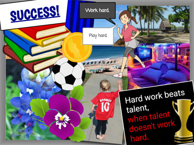 Next, look at the words in your cluster diagram and find pictures, phrases, and quotes that represent these goals, inspire you to do the work, and demonstrate how you think you will feel when you have met them. In other words, what does your success look like?